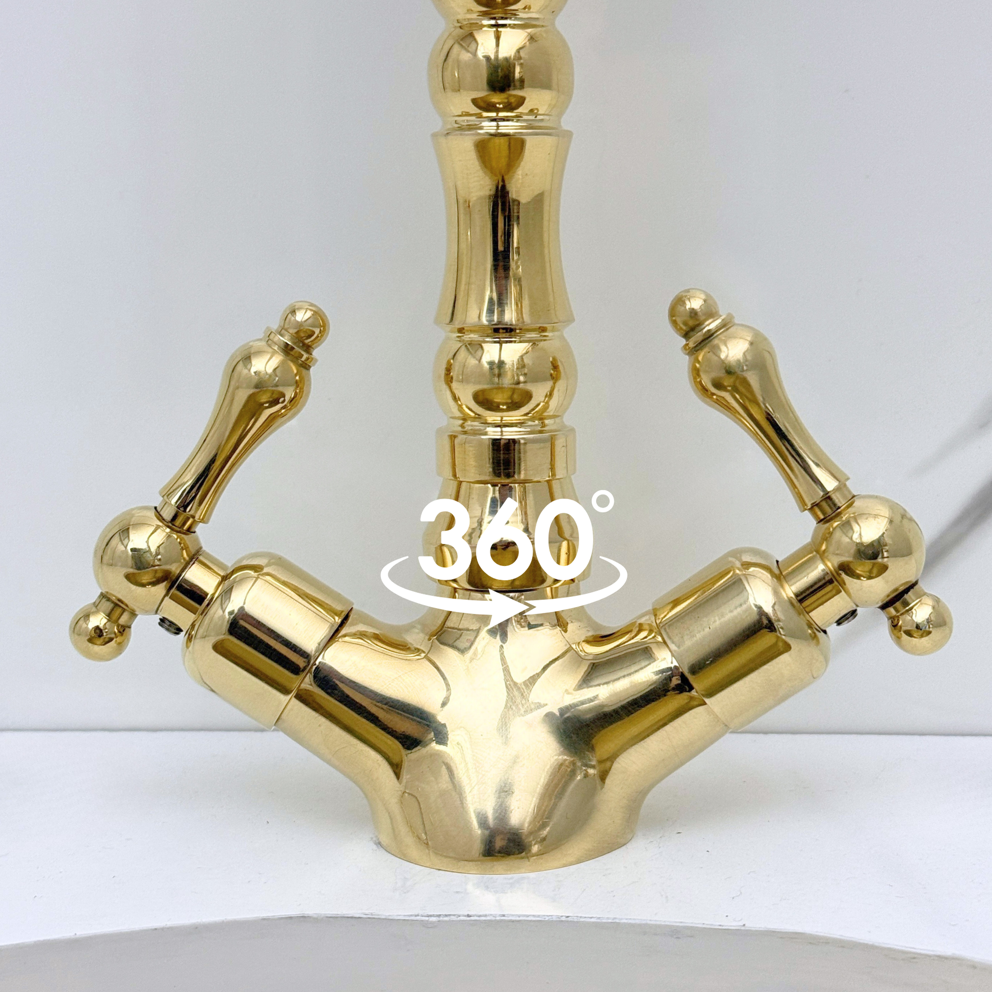 Elevate your bathroom vanity with this exquisite Single Hole Bathroom Faucet. Crafted from premium solid brass, it features a natural unlacquered finish that develops a graceful patina over time. Showcasing a gracefully curved spout with a full 360-degree rotation, intricate vintage-inspired ribbed detailing, and classic lever handles, this deck-mounted fixture combines timeless elegance with modern functionality. This versatile range of motion makes it an ideal choice for both bathroom vanities and small kitchen sinks. The integrated two-handle design ensures precise temperature control, while the single-hole layout provides a clean, space-saving custom look.