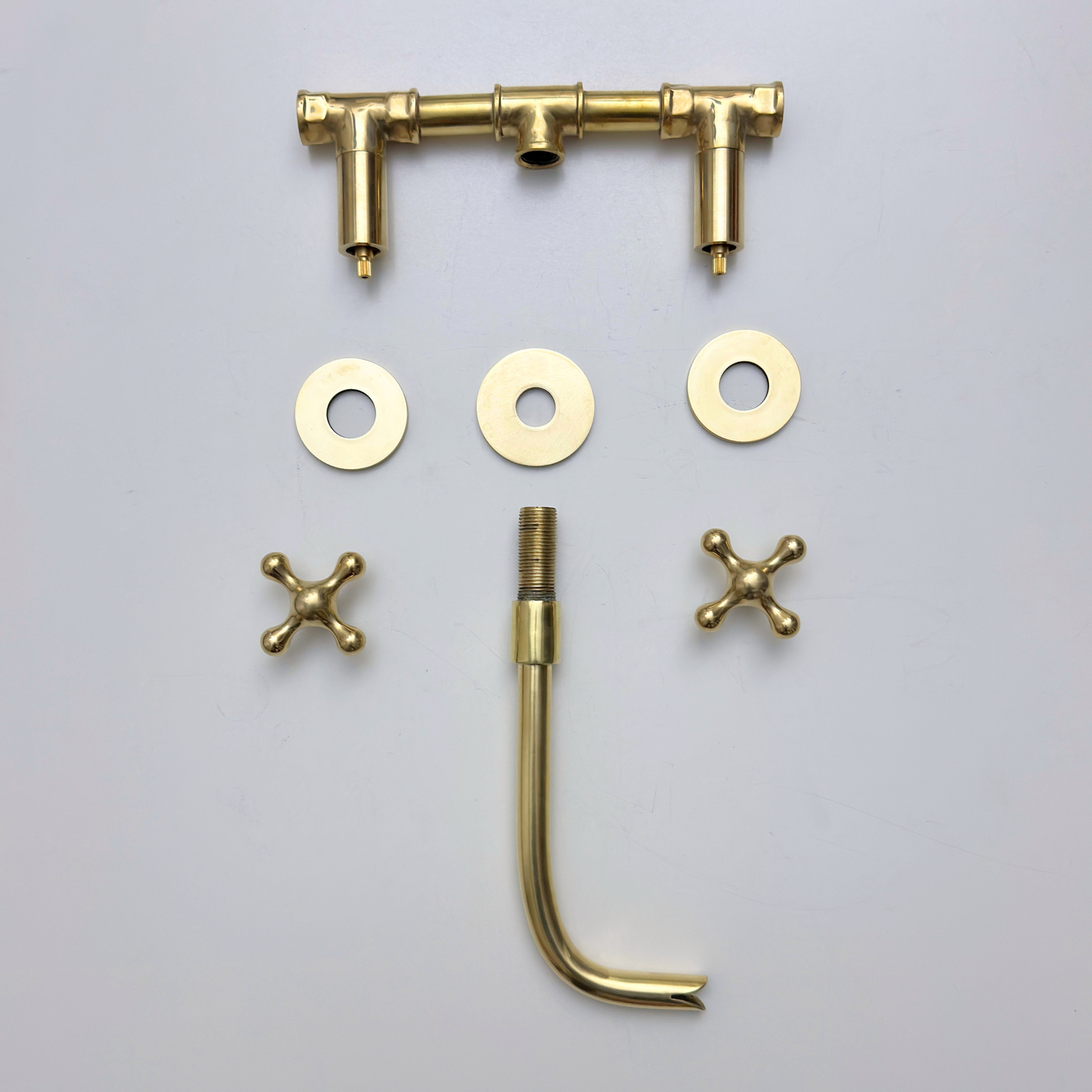 Elevate your bathroom with the sculpted elegance of our Unlacquered Brass Wall-Mount Faucet. Crafted from premium solid brass, it features a natural unlacquered finish that develops a graceful patina over time. Featuring a sleek curved spout and ergonomic Cross handles, it offers a refined aesthetic and effortless control, making it a timeless centerpiece for any bathroom.